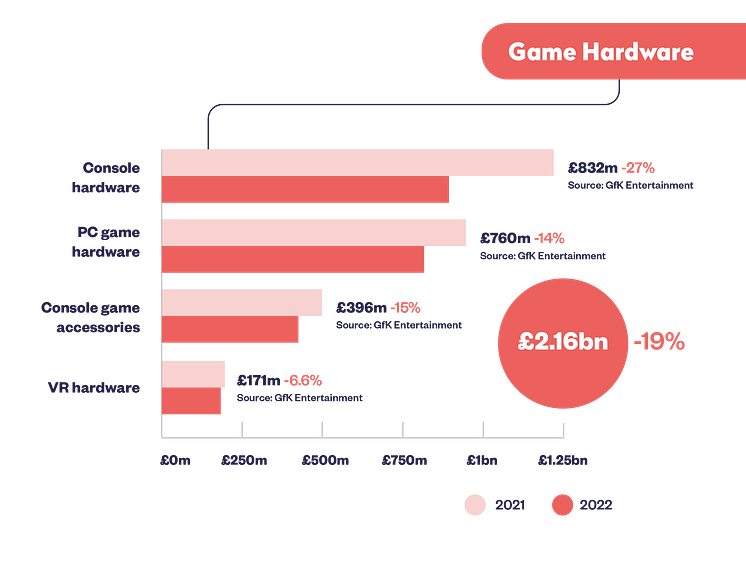 Compared to 2021, sales of all forms of video game hardware in 2022 were down 19% to £832 million, with console revenue down 27%, PC game hardware 14% and VR hardware by 6.6% year-on-year.